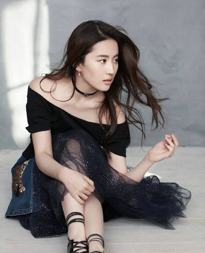 刘亦菲黑色一字肩裙装搭配冷色调裙摆,眼神疏离,散发冷艳时髦气息